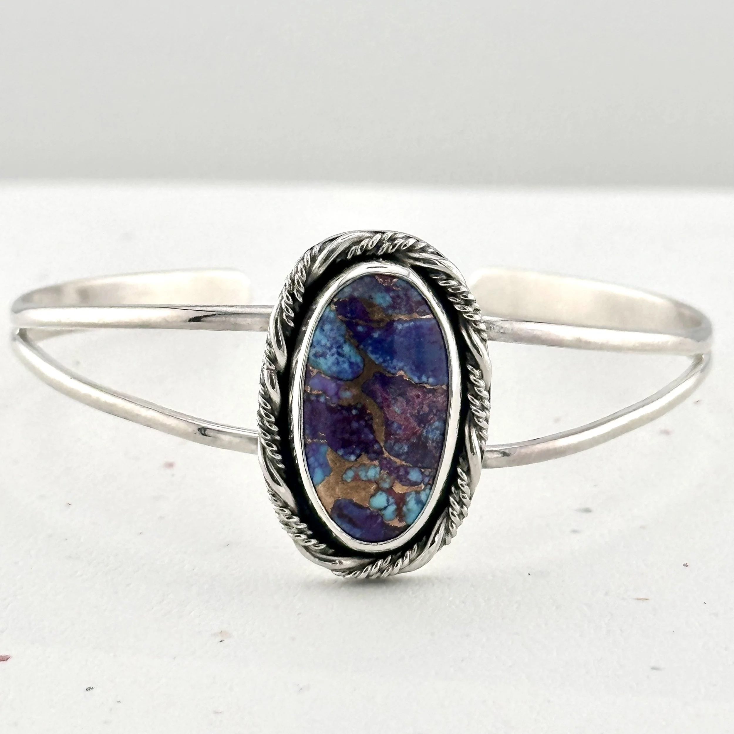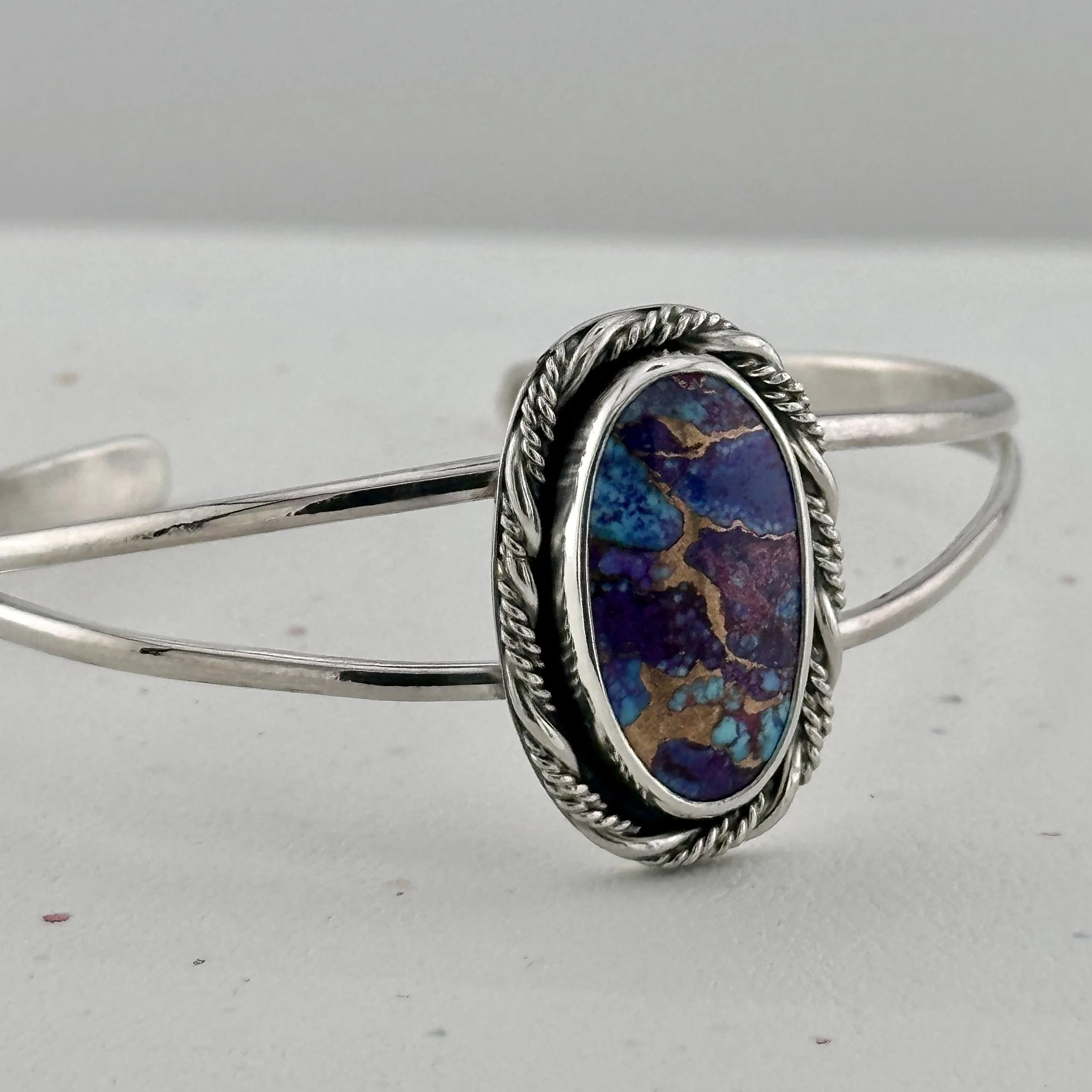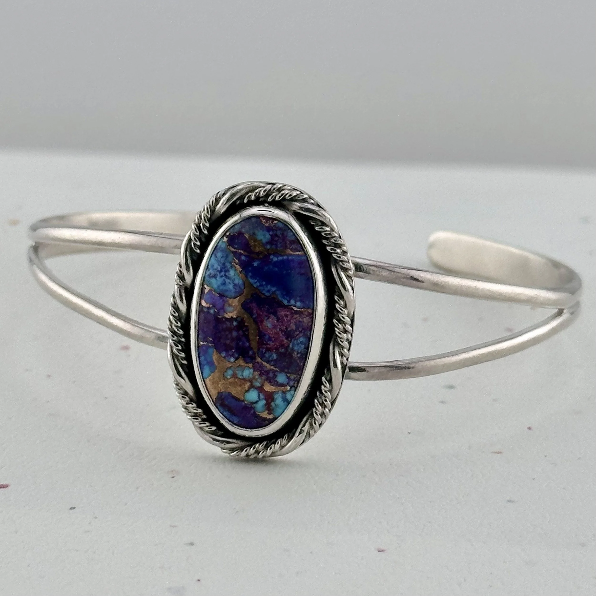 The stone is Purple Mojave Turquoise from Kingman, Arizona. It is a composite stone made of scraps of Kingman Turquoise left over from making beads. some of it is dyed, some remains the natural color. These are then mixed with bronze or copper and resin, then formed into blocks under pressure. The bock is cut into slices, then the lapidaries cuts them into cabochons. It is a great use of left over turquoise, so nothing goes to wast. Plus-it just makes a pretty stone!