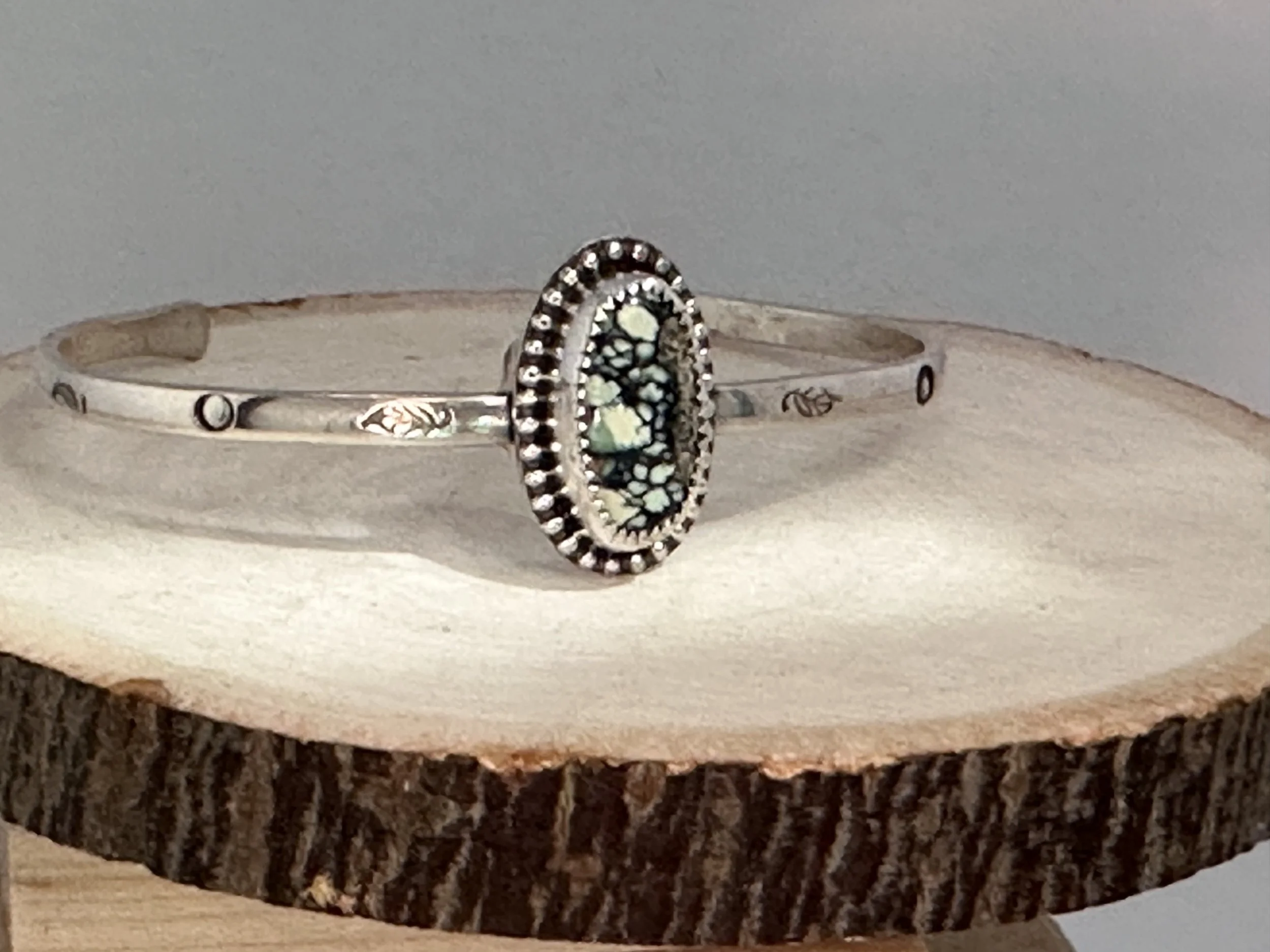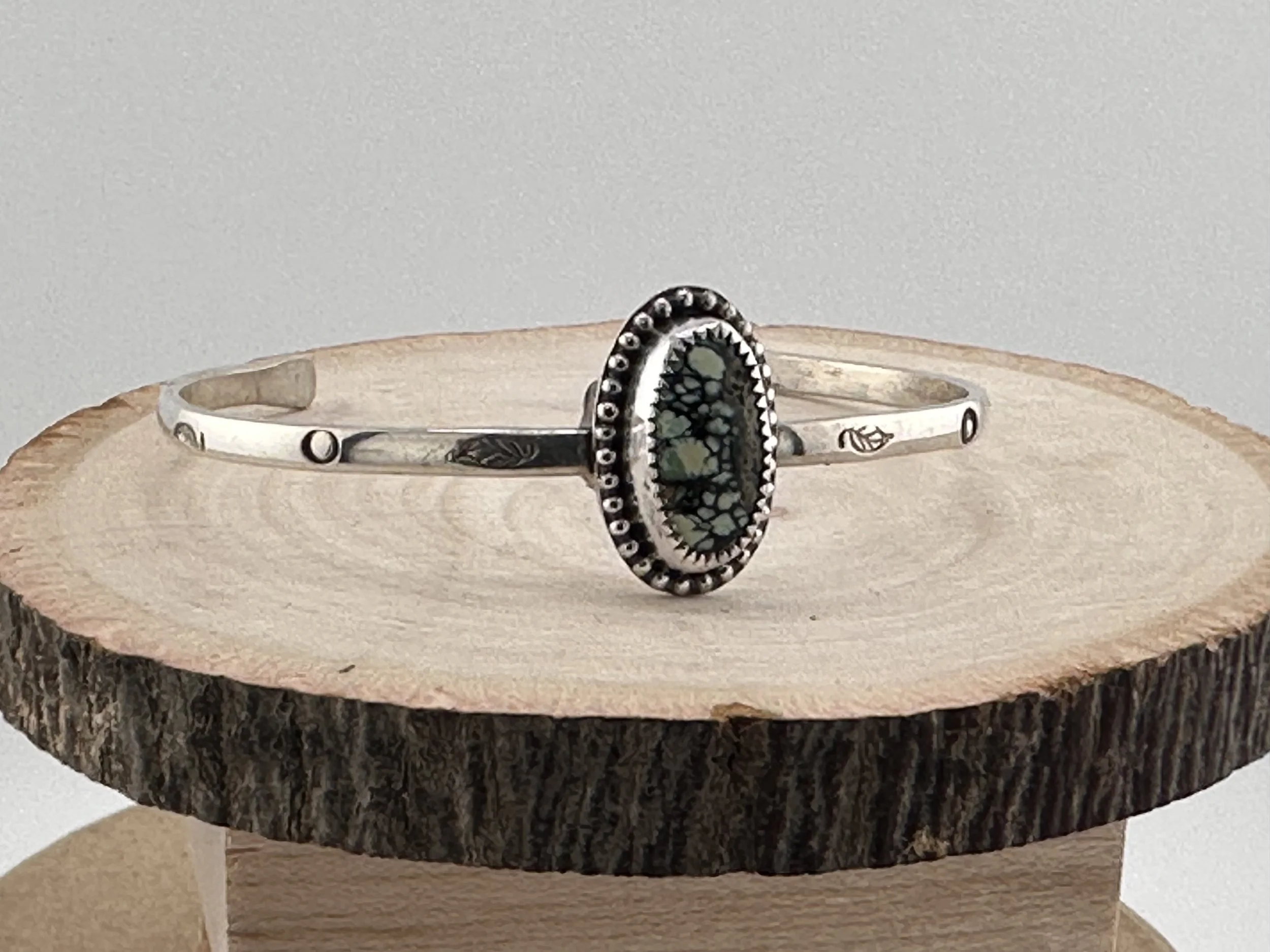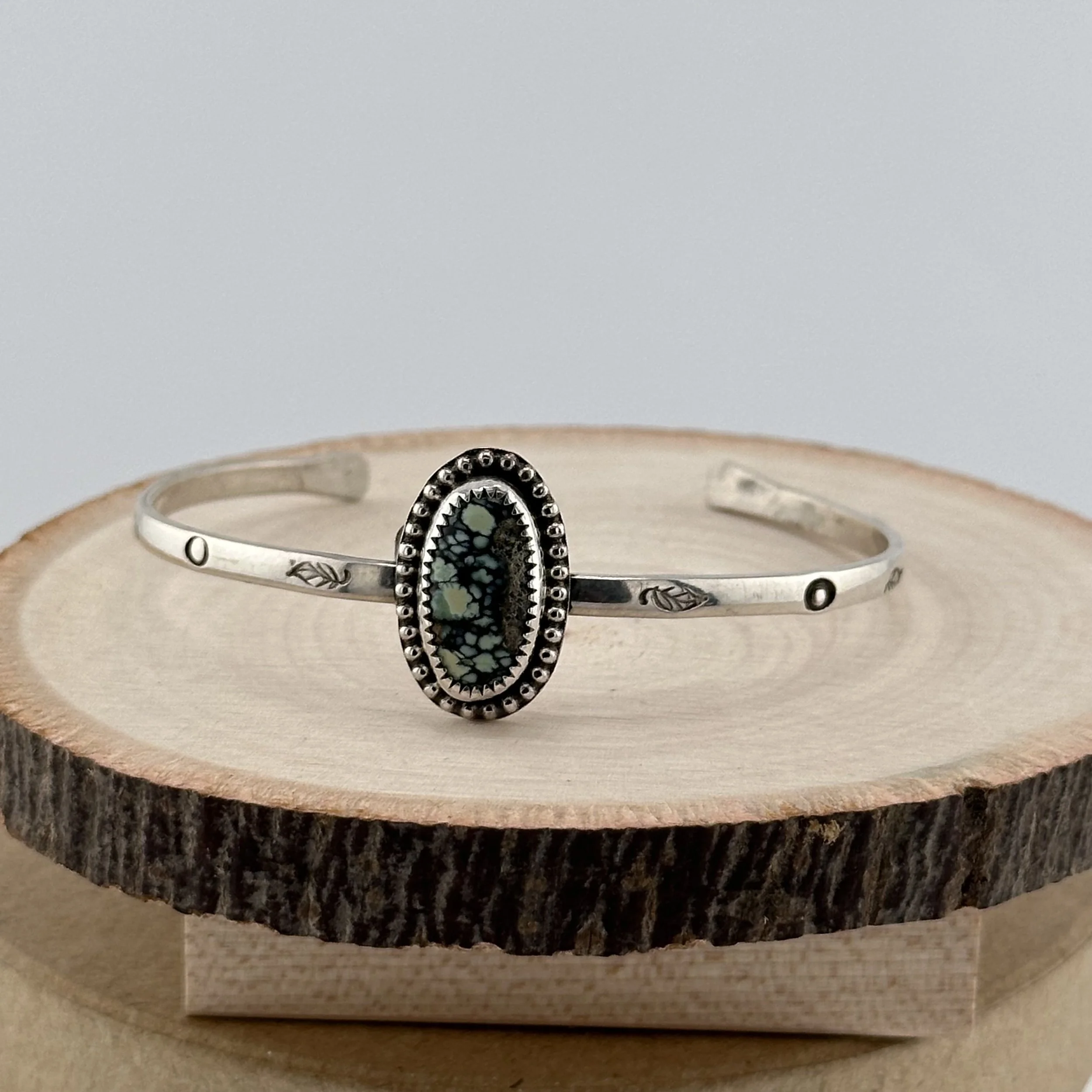 This stunning Angel Wing Variscite, sourced directly from the beautiful landscapes of Nevada, features an exquisite minty green color. It is meticulously set in a blend of fine and sterling silver, showcasing a delicate sterling silver ball wire frame. This captivating piece is elegantly mounted on a beautifully stamped sterling silver cuff, making it not only a unique accessory but also a true work of art.