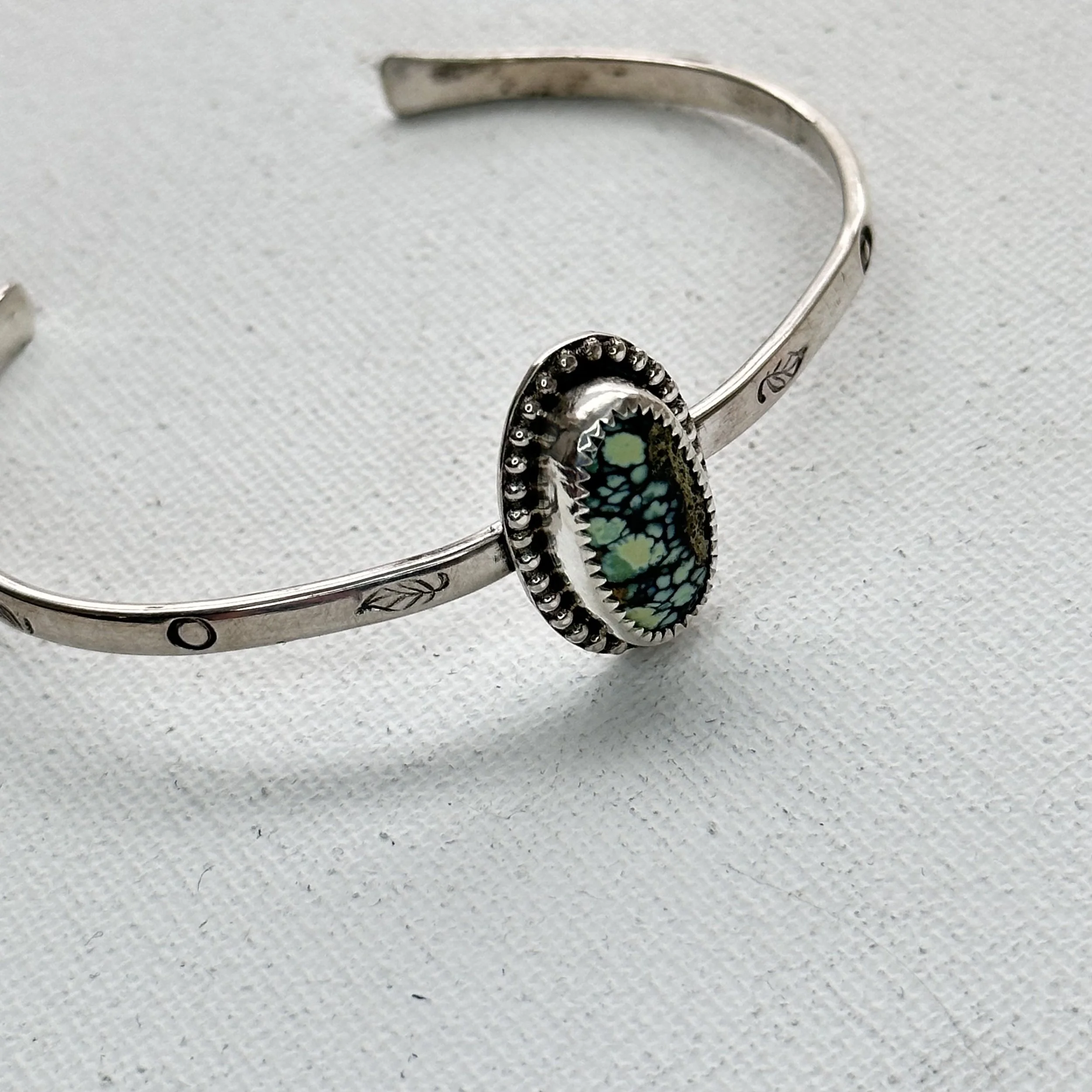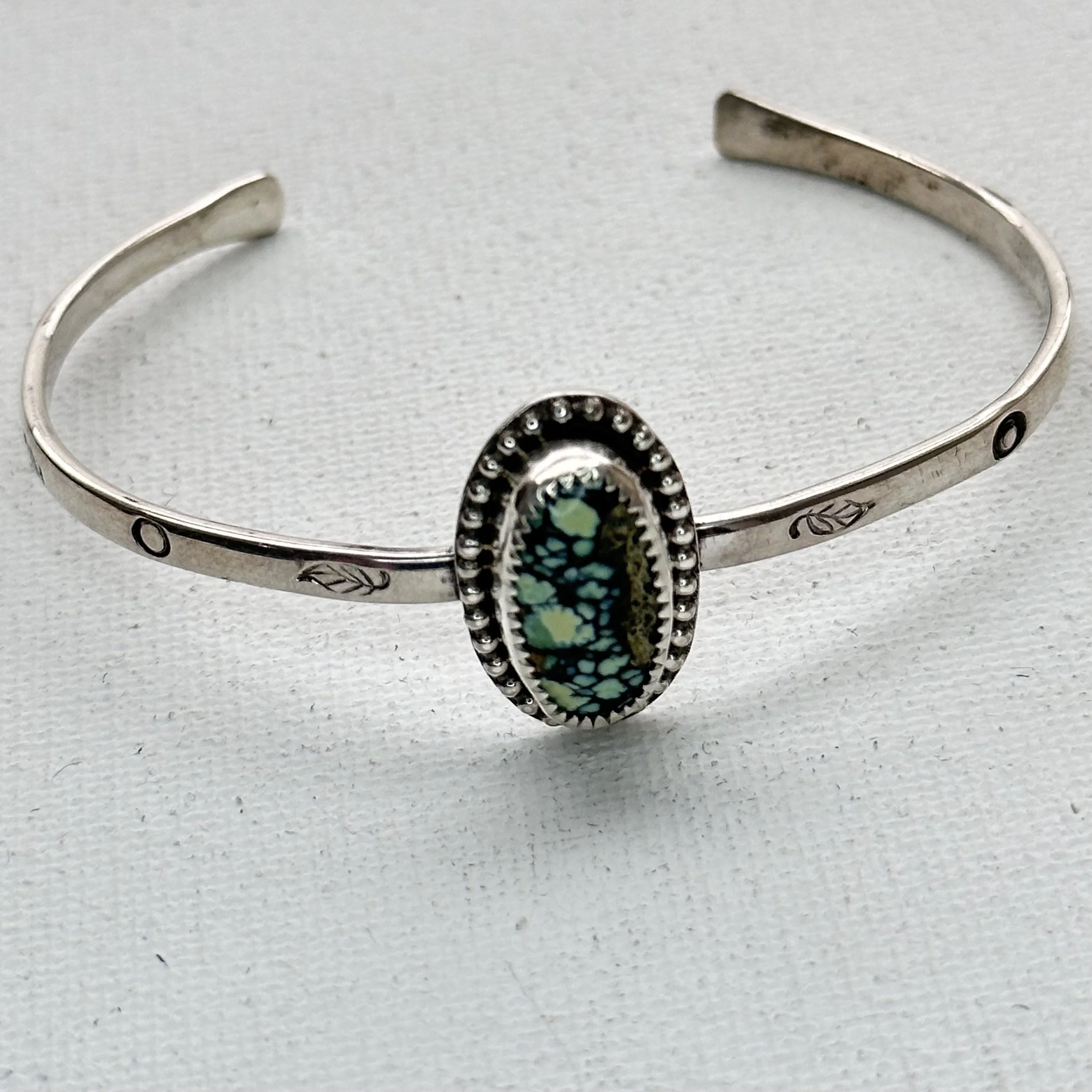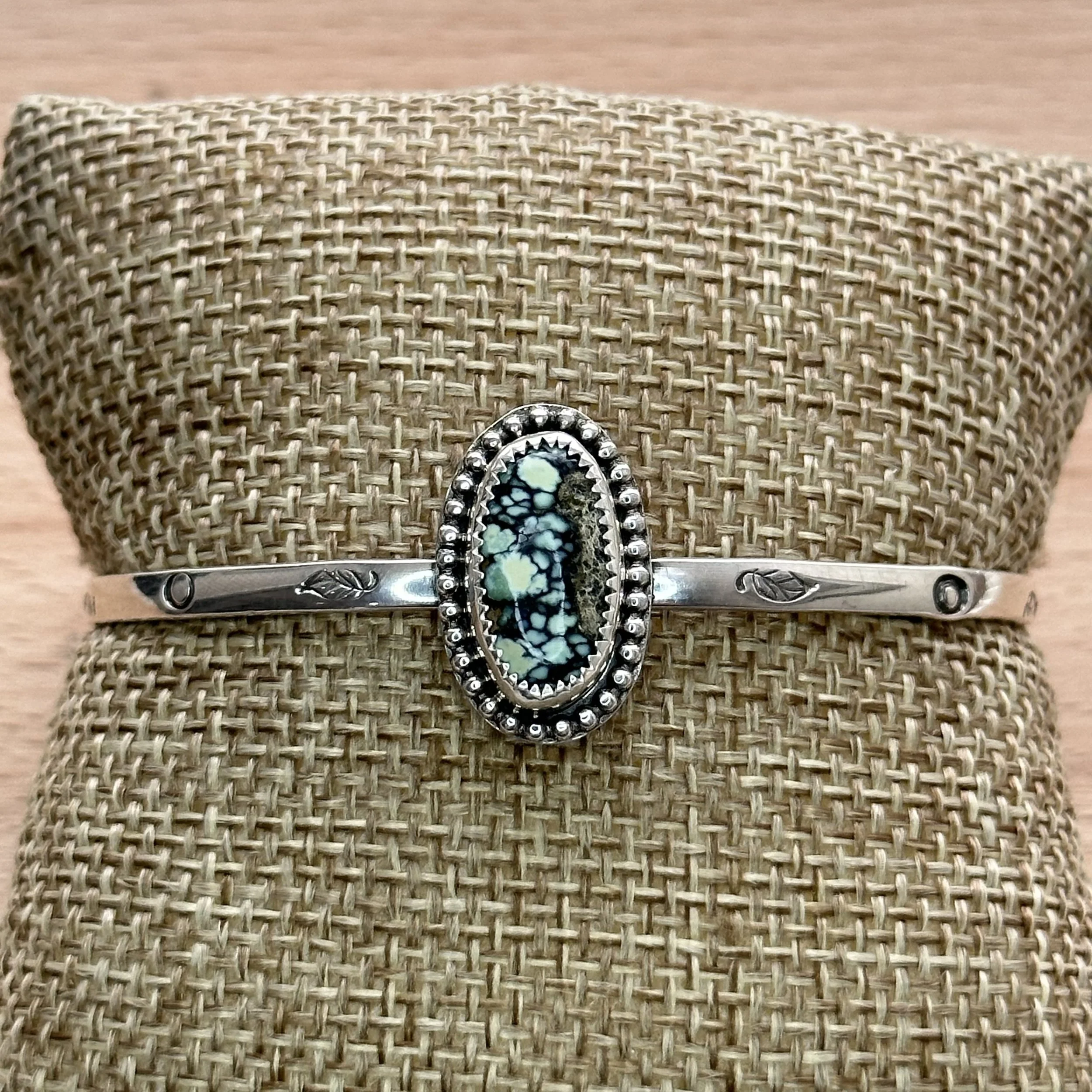 This stunning Angel Wing Variscite, sourced directly from the beautiful landscapes of Nevada, features an exquisite minty green color. It is meticulously set in a blend of fine and sterling silver, showcasing a delicate sterling silver ball wire frame. This captivating piece is elegantly mounted on a beautifully stamped sterling silver cuff, making it not only a unique accessory but also a true work of art.