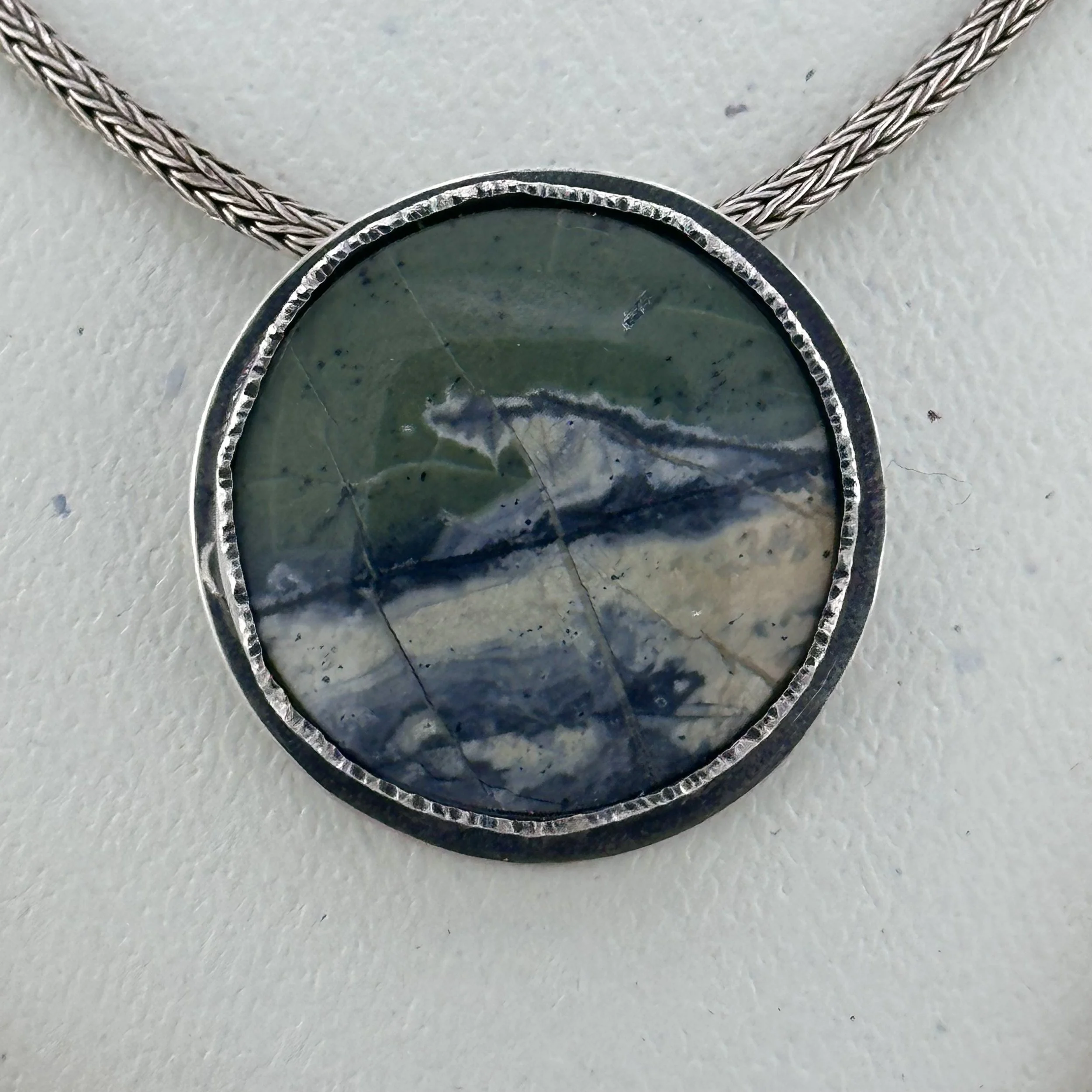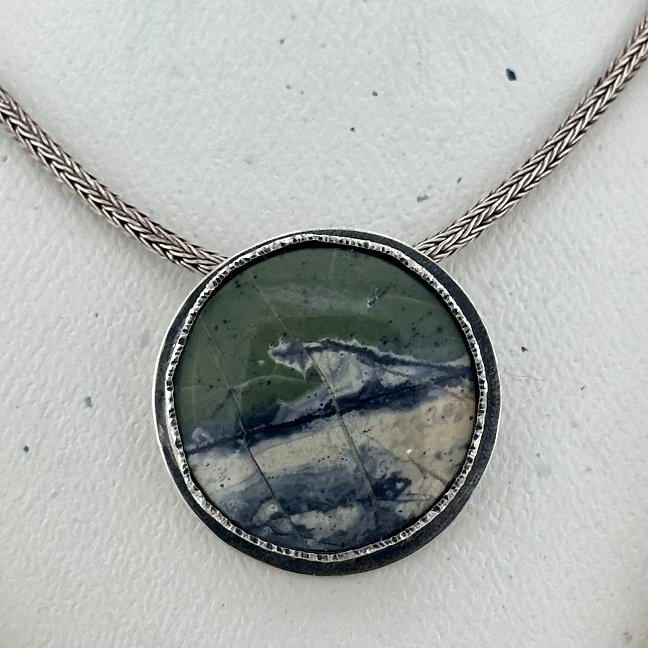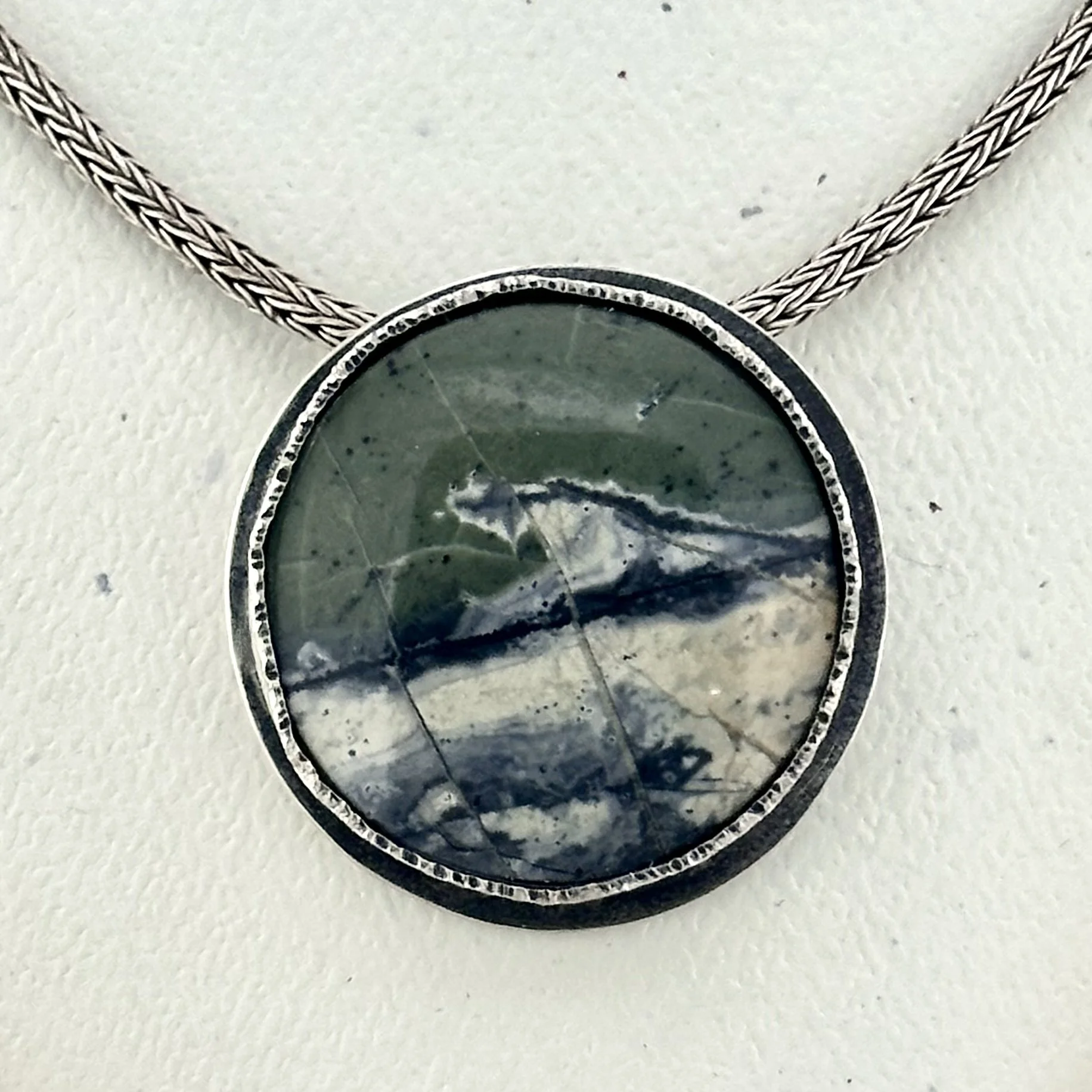 This lovely large round stone, known as Green Maligano Jasper, showcases stunning natural patterns and rich colors that make it truly unique. It is set in a heavily textured sterling silver bezel, which adds depth and character to the piece. Following this, the metal has been thoughtfully oxidized to give it a beautifully aged appearance that enhances its rustic charm. The pendant gracefully hangs from a sturdy, thick, 18-inch sterling silver foxtail chain, ensuring that it will be both comfortable and eye-catching when worn.