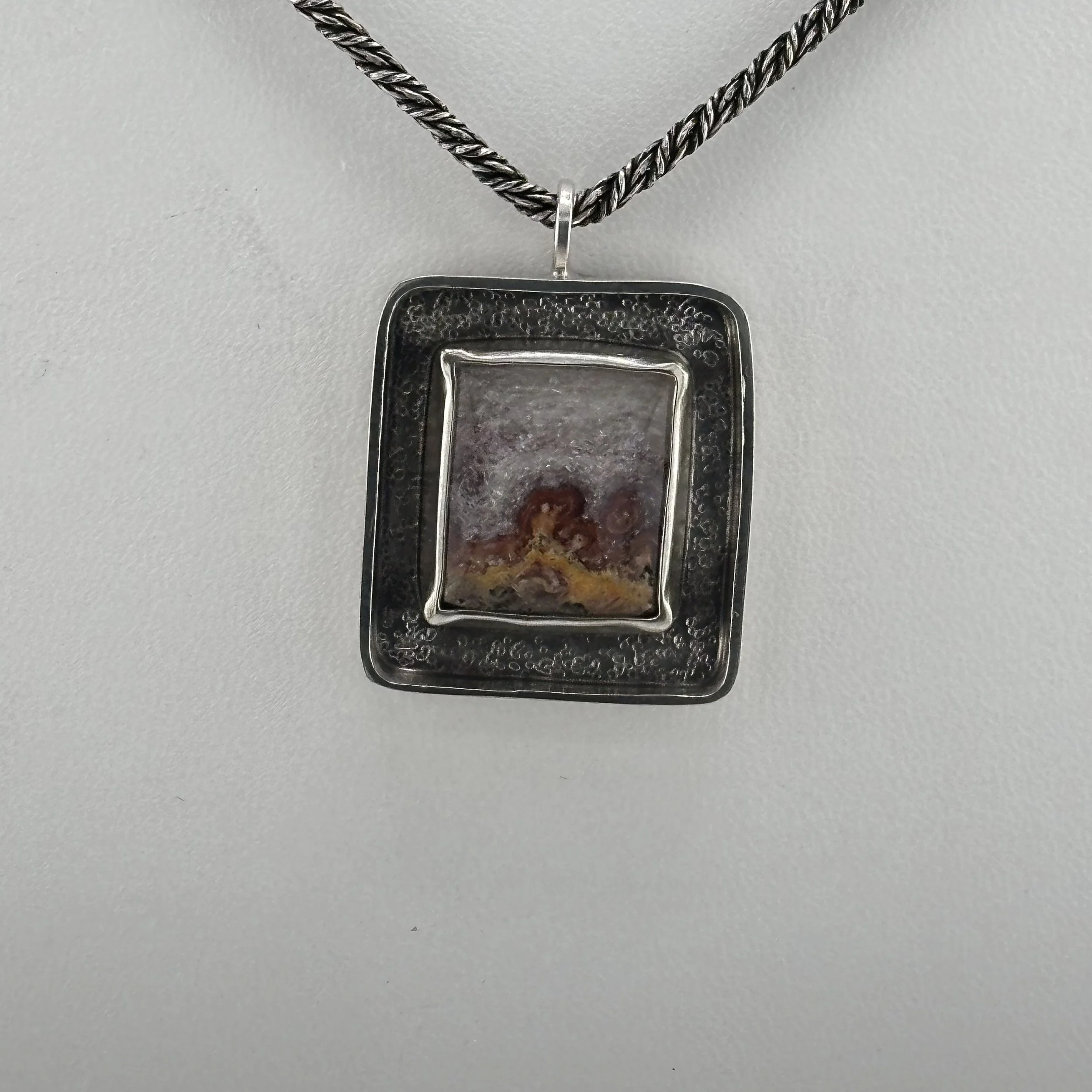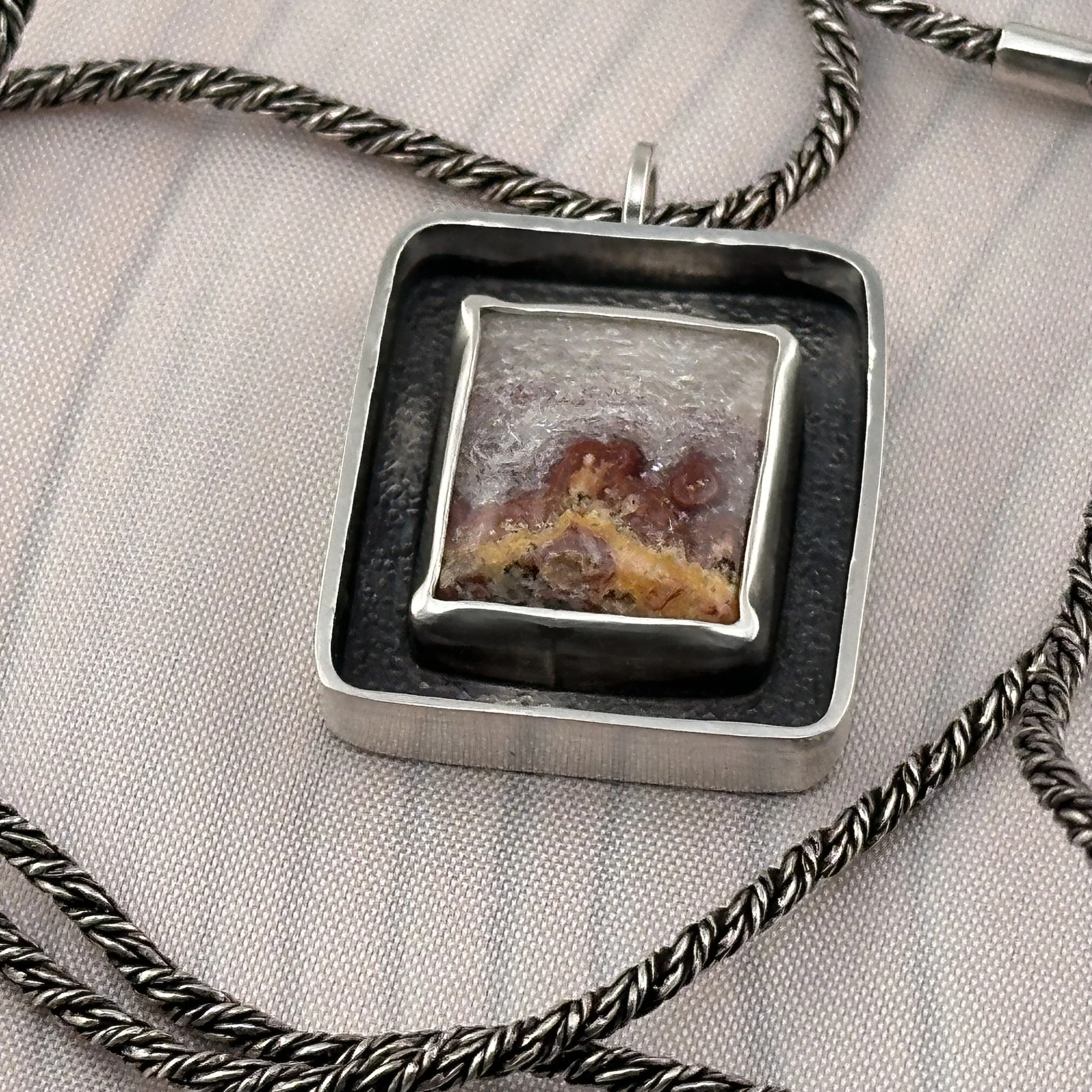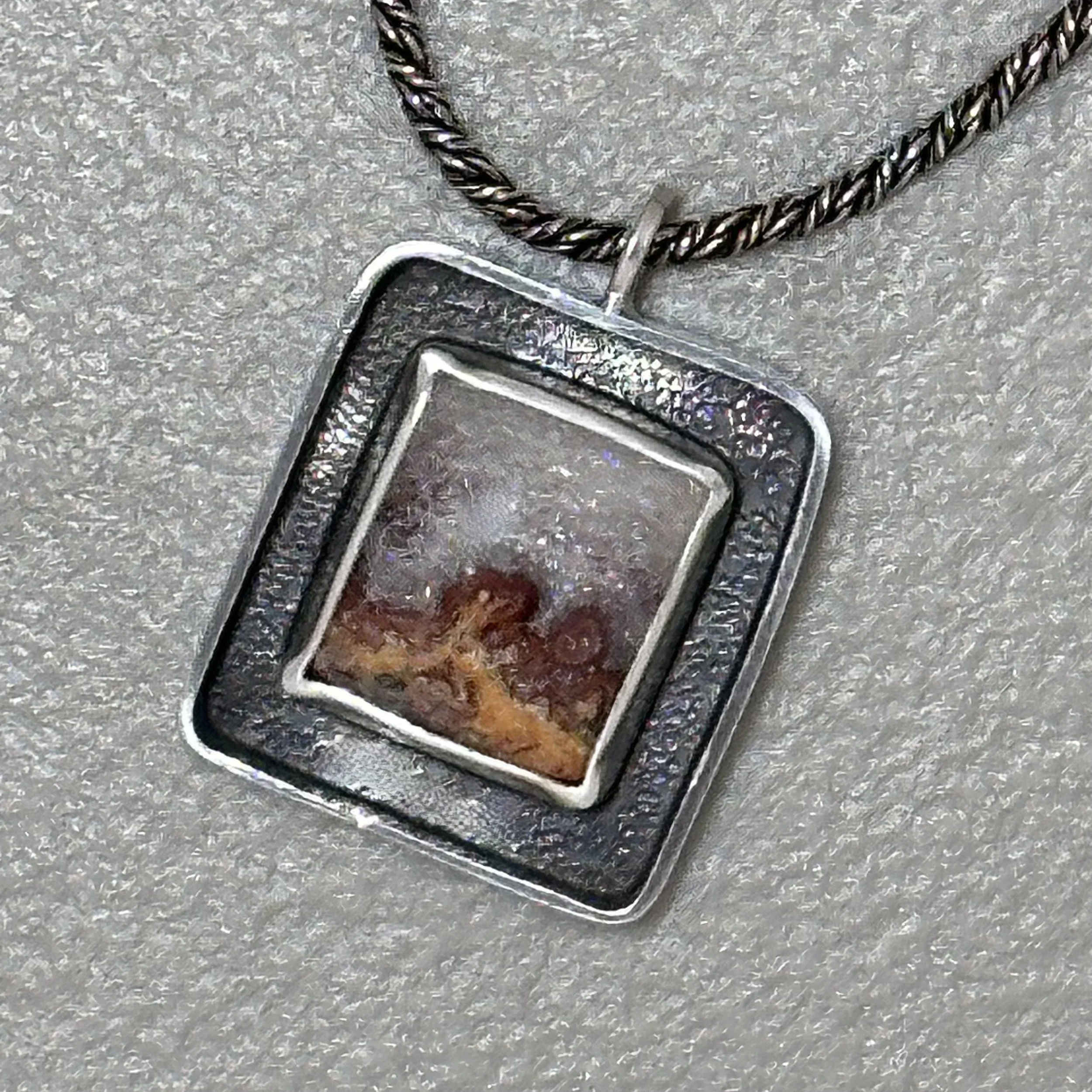 The exquisite stone featured in this piece is Wildfire Opal, sourced from the breathtaking landscapes of Utah. This captivating gemstone displays stunning crystalline patterns that evoke the imagery of delicate snow gently blanketing the vibrant earth on a crisp autumn day. The pendant, measuring a charming one inch square, is elegantly set within a sterling silver shadow box that highlights its unique beauty. The chain shown in photo is NOT the chain the pendant is on now. It is on an 18” Sterling silver Snake chain.5