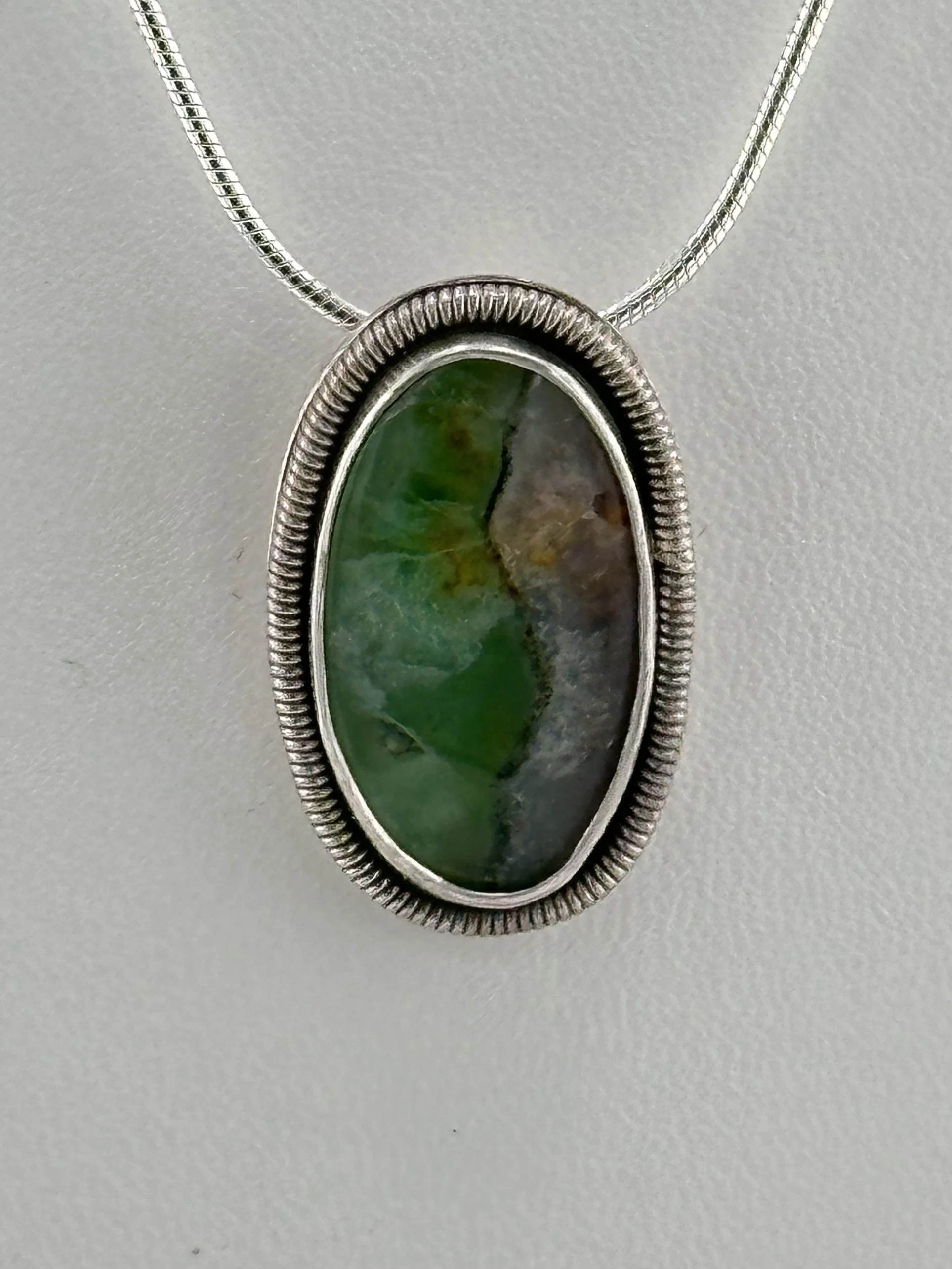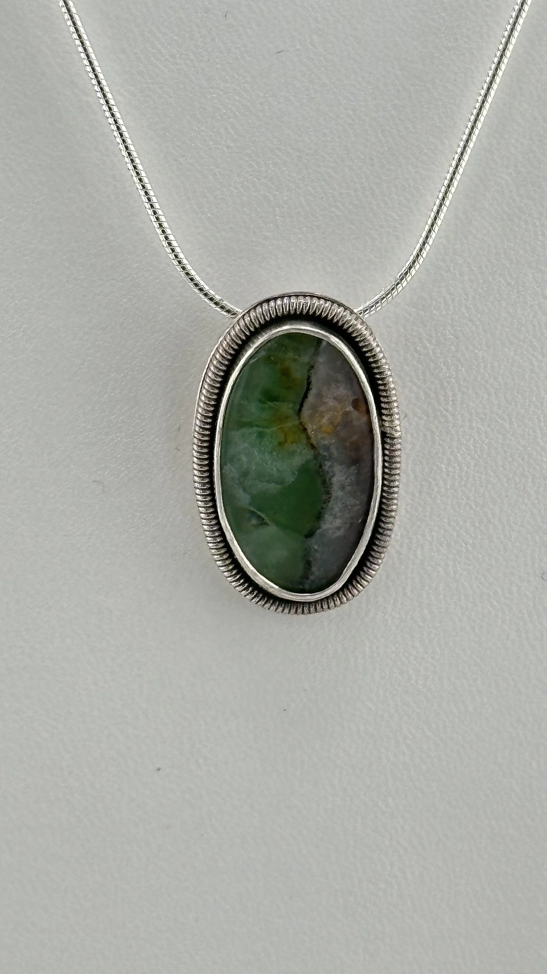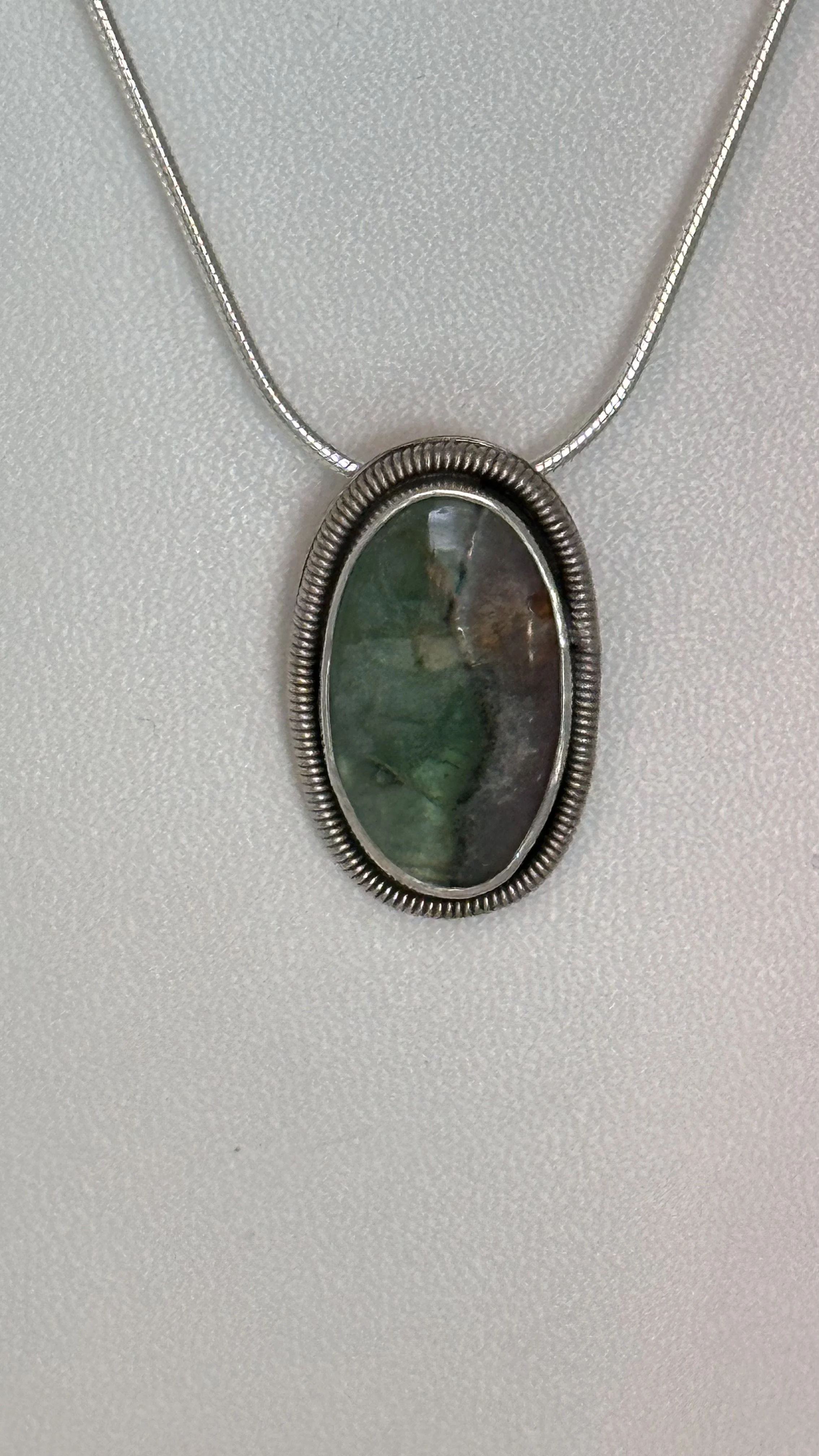 This enchanting stone was carefully mined in the stunning region of Colorado, close to the charming town of Marble. It features a captivating combination of Amethyst and Fluorite, showcasing beautiful hues of lavender purple gracefully blending with delightful mint green. This gorgeous mix creates a striking visual appeal that is truly unique. The pendant itself measures an elegant 1” in length and 3/4” in width, making it a perfect statement piece, and it is elegantly hung on an 18” sterling silver snake chain for added sophistication.